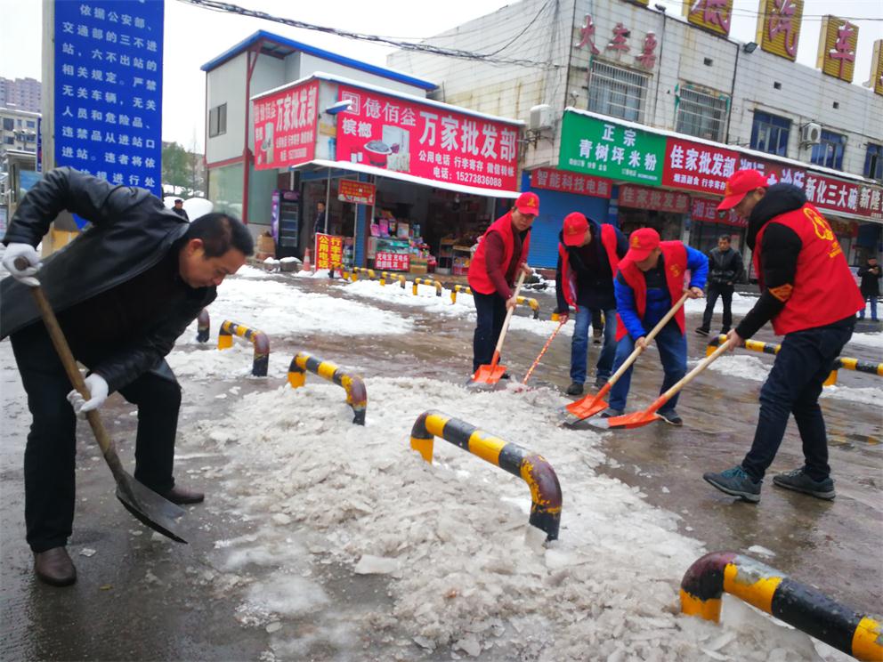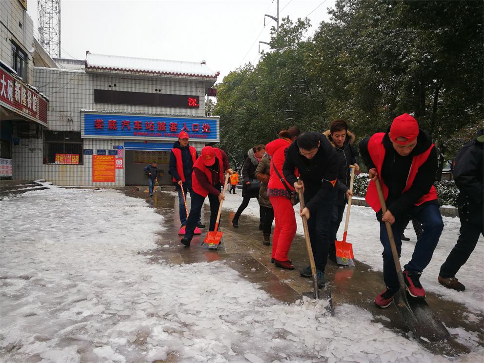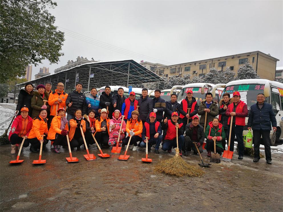 早上八點半,在車站生產(chǎn)副經(jīng)理付育平帶領(lǐng)下,辦公室、調(diào)度、稽查大隊、營收監(jiān)控隊、服務(wù)班、安保等部門近20多名志愿者拿著鏟子、鐵鍬和竹掃把等工具,對車站旅客入口處通道、車輛進站通道、車站站坪、短途通道、車輛出站通道等地的堅冰進行鏟除,寒風凜冽,積雪厚重,冰塊堅硬,但我們的雷鋒志愿者們熱情高漲,大家發(fā)揚不怕若不怕累的精神,齊心協(xié)力,分工合作,揮鍬掄鎬,鉚足了勁,發(fā)起了挑戰(zhàn)嚴冰暴雪的攻堅戰(zhàn),在車站奏響了美妙的樂意,汗水濕透了背脊,手掌磨起了血泡,冰雪打濕了鞋襪,大家全然不顧,只看見一頂頂小紅帽在雪地上不停的運轉(zhuǎn),很多駕駛員和班線承包人紛紛加入鏟雪隊伍,婁星微馬隊的20多名隊員們在他們隊長的帶領(lǐng)下也來到車站幫著一起鏟雪除冰,他們橙色的微馬隊服也是一道道靚麗的風景線。大家都有一個共同的名字——學雷鋒志愿者!他們的一言一行彰顯真情,贏得了過路市民的連聲稱贊!